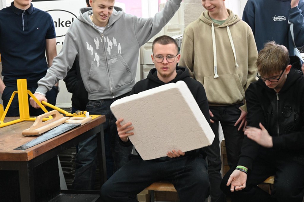 Podczas części teoretycznej uczniowie uczestniczyli w prezentacji „Efektywna budowa – szybkie, lekkie i proste budowanie z dużych formatów Xella”, dzięki której poznali innowacyjne systemy murowe, zasady projektowania i montażu elementów oraz ich właściwości techniczne. Zrozumieli, jak nowoczesne materiały wpływają na tempo i jakość realizacji inwestycji, a także jak łączy się teoria projektowa z praktyką wykonawczą.