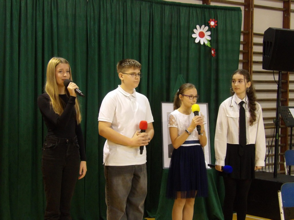 Obchody rozpoczęły się od złożenia kwiatów i zapalenia zniczy pod tablicą upamiętniającą patrona. Słowa „Cześć jego pamięci” wybrzmiały jako symboliczny hołd dla człowieka, który całe życie poświęcił wierze, nauce i służbie Śląskowi. Po tym upamiętnieniu ks. Konstantego Damrota uczestnicy zostali zaproszeni do sali gimnastycznej, gdzie odbyła się dalsza część obchodów – radosna, ale też pełna refleksji.