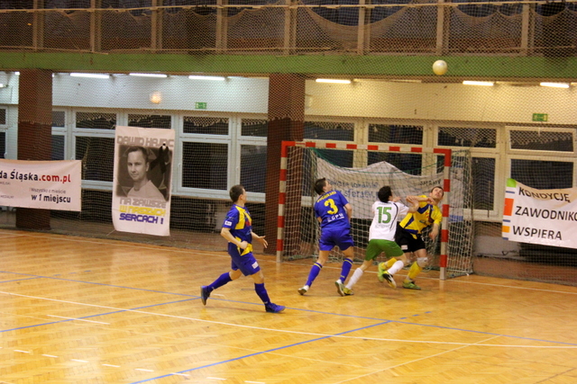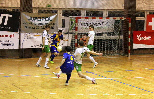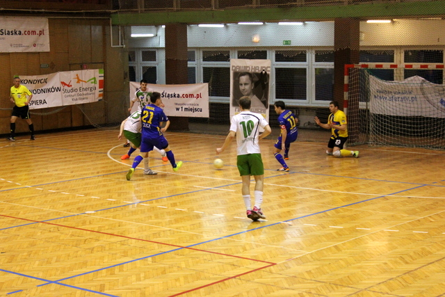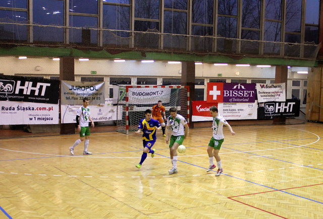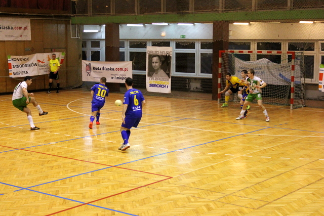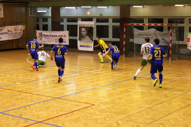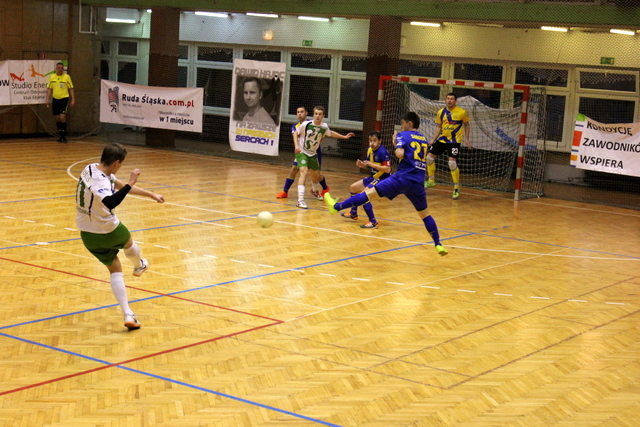 W 28 minucie po rzucie wolnym bramkę kontaktową zdobyli goście. Taki stan rzeczy dodatkowo zmobilizował rudzian. W 31 minucie podanie Piaseckiego wykorzystał Krzymiński. Później kolejno na listę strzelców mogli wpisać się: Piskorz, Piasecki, Łuszczek i Martyn, ale oddane przez nich strzały był minimalnie niecelne. Do bramki gości trafił w końcu w 37 minucie Łuszczek, który z własnej połowy skierował piłkę do pustej bramki i było 4:1. Przyjezdni nie złożyli jednak broni. 22 sekundy później, po faulu Łuszczka, wykorzystali karny, a nieco ponad minutę później po strzale z dystansu zdobyli bramkę kontaktową. Niecałe dwie minuty przed końcem spotkania zawodnik AZS-u dobił strzał swojego kolegi, doprowadzając do remisu 4:4.